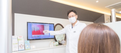 納得いただくまでしっかりと時間をかけて説明を行います。また、十分に理解頂くために大型モニターを各チェアに設置し、口腔内カメラの写真や、レントゲン画像などを見ながら診療方針をご説明させて頂きます。